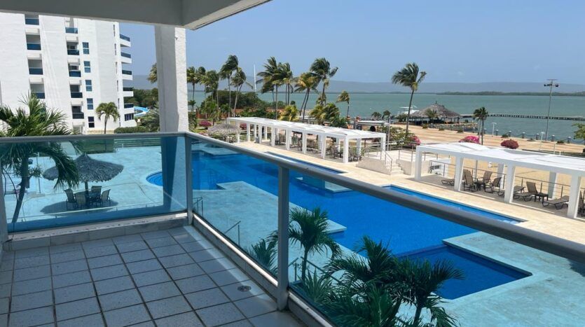 corrediza para salida a la terraza. -Amplia terraza con vista panorámica a las piscinas, muelles, parrilleras y demás