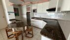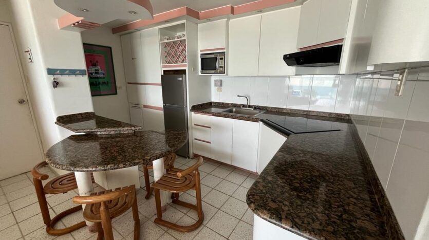 de granito con múltiples gabinetes aéreos y de base, equipada con plancha de
