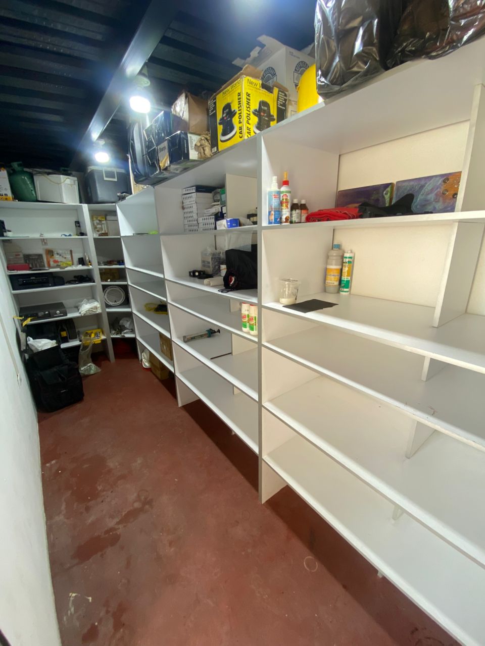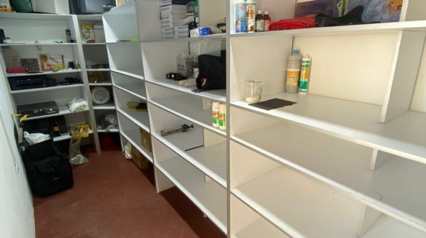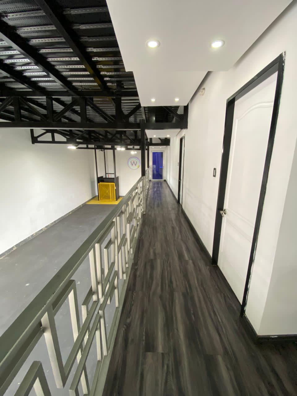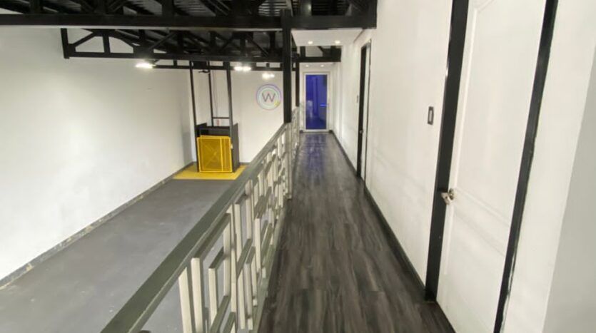 área de swowroom con techos en Drywall decorados , baño de visitantes, área de Coffe brake, cuarto de bombas con sistema de Hidroneumatico, tanque subterráneo de 20 mil litros y pozo propio, rejas en tubo estructural, portón eléctrico, Santa María eléctrica (doble acceso) puerta peatonal blindada, pequeño maletero debajo de las escaleras, ascensor de carga en planta baja con parada en nivel depósito y nivel terraza, escaleras a mezzanina y nivel depósito en madera, paredes en bloque relleno, pisos en pintura de intemperie.