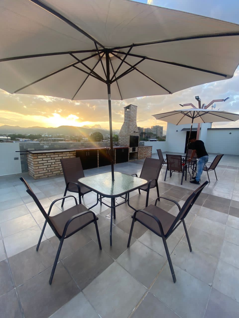 Área libre con sillas, mesas de lujo de intemperie con paraguas, área de parrillera, ahumador, caja china, cocina a leña.