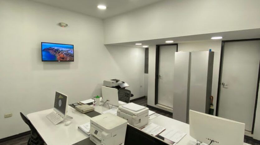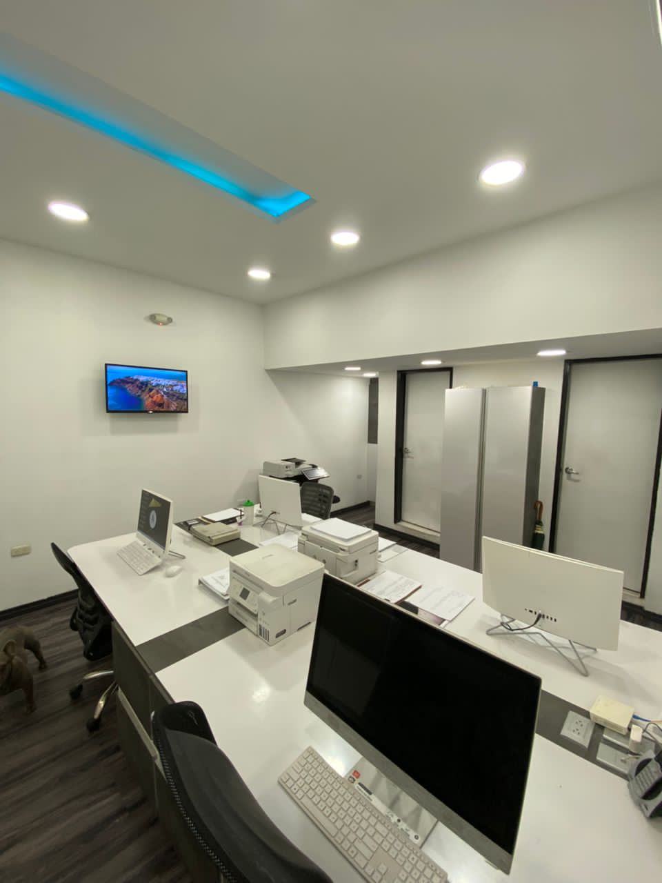 4 estaciones de trabajo con sus pc modernas, impresoras multifuncionales y modernas todo en color blanco y gris, archivadores, módulos, techos en Drywall decorados, tv, Internet satelital, 2 Baños, aire acondicionado